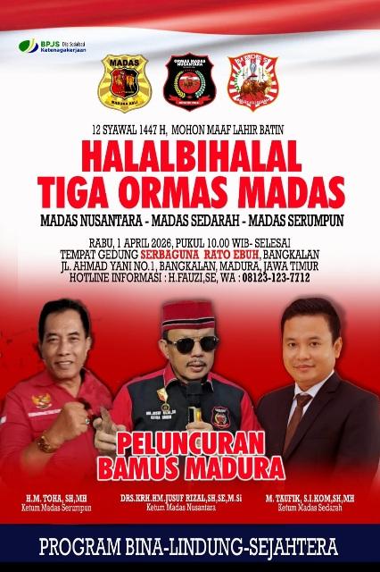 PAMEKASAN, BABEMOI.ID — Ormas Madas Nusantara mengundang seluruh ormas ke-Maduraan pada Peluncuran Bamus Madura, yang dirangkai acara Halal Bihalal di  1 April 2026 di Gedung Pertemuan Rato Ebuh, Bangkalan, pada 1 April 2026 mendatang.